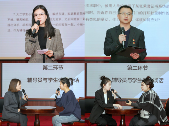 活动伊始,学生工作部思政办副主任常大地向现场参会人员简要介绍本次大赛的举办情况,并就当日决赛要求进行简要说明。随后,12名参赛辅导员开始逐一进行比拼。决赛共分为三个环节,分别为“个人介绍+才艺展示”、谈心谈话以及案例分析。“谈心谈话”环节成为本次赛事亮点,选手需在8分钟内与由“专业演员”扮演的“问题学生”展开对话,真实还原辅导员日常工作中的复杂场景。面对学生“情感纠葛”“心理健康”“同学矛盾”等棘手情境,选手们以情动人、以理服人,展现了思政工作者“亦师亦友”的角色担当。经过近5个小时的激烈角逐,各环节展示圆满完成。大赛最终评选出了一等奖1名,二等奖3名,三等奖3名,优秀奖5名。